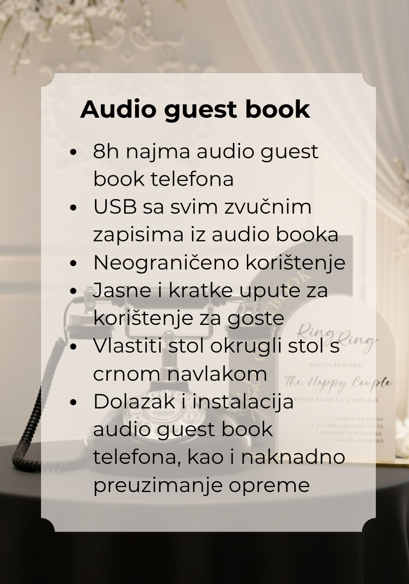 Audio guest book telefon je zapravo stari retro telefon koji na svadbama služi kao zabavna i emotivna knjiga gostiju — samo što se umjesto pisanja poruka, one snimaju glasom.